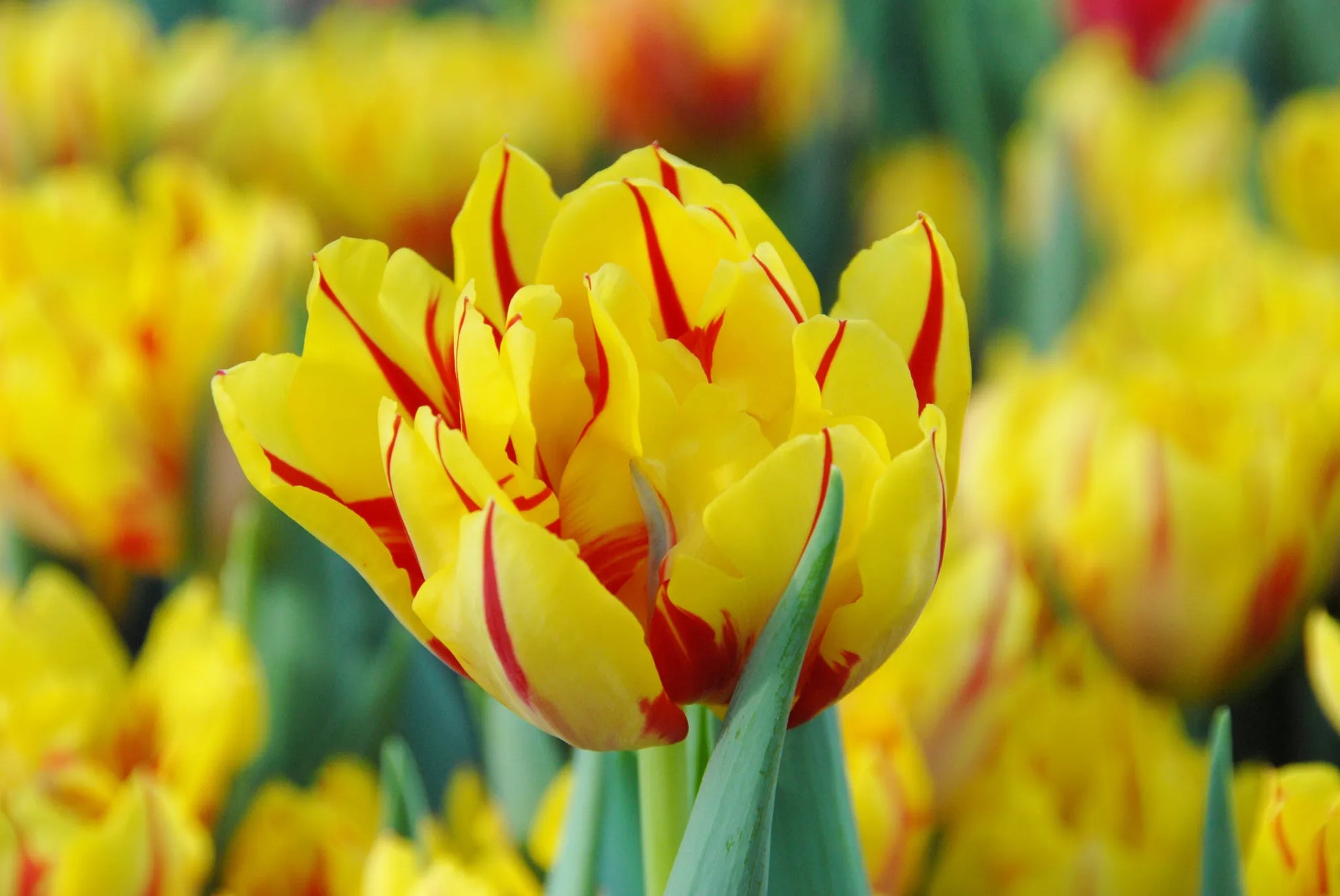 Tulip foliage , although often aesthetically underestimated after flowering, plays a central role in its growth cycle and bulb quality . Tulips develop a limited number of leaves , arranged alternately on the stem, with a fleshy texture and shallow veins .
