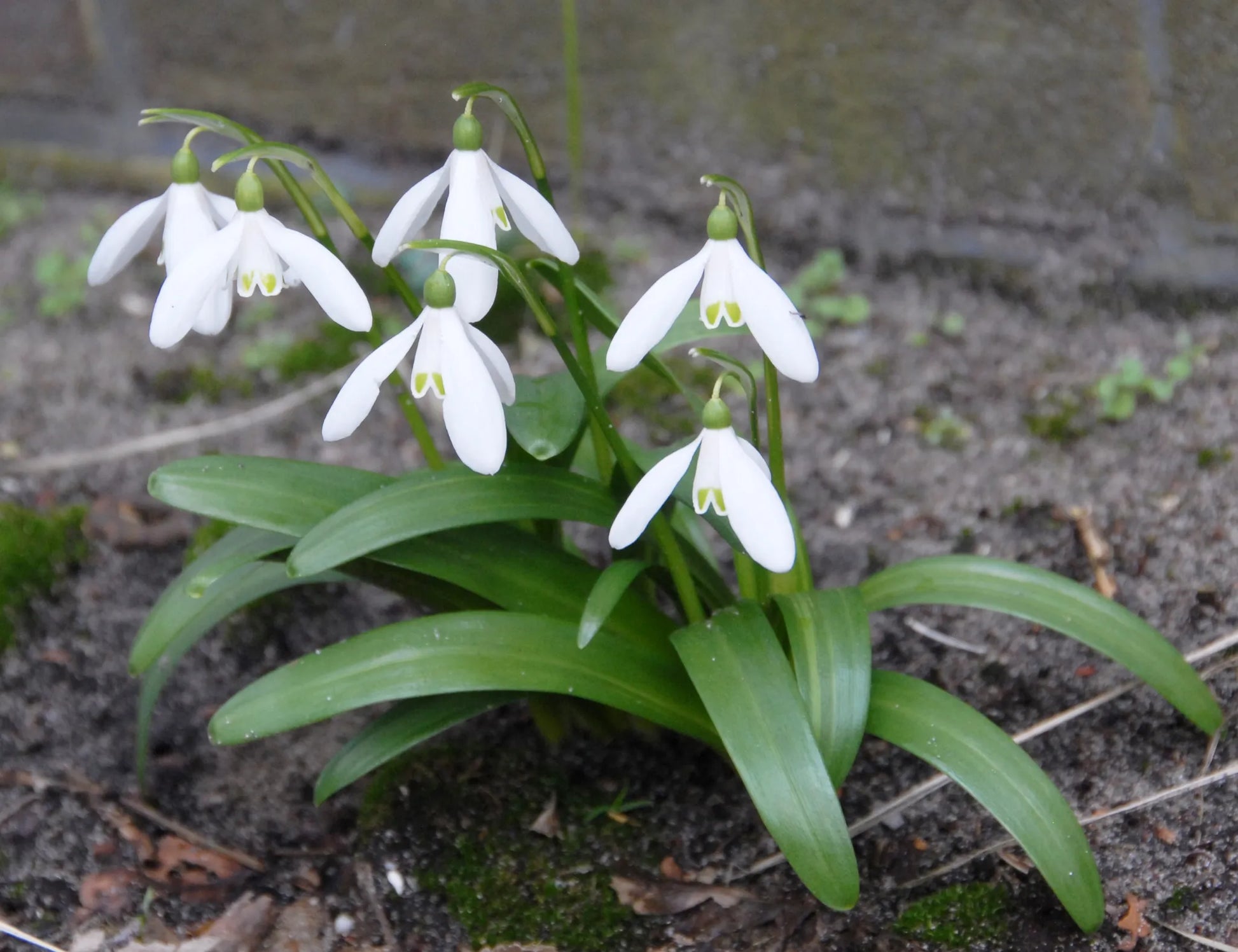 Galanthus nivalis is a tunicate bulb plant . Although the precise dimensions and exact color of the bulbs are not specified in the sources, it is described as a perennial monocotyledonous bulb . From this bulb typically emerge two to three linear or narrowly lanceolate leaves , grayish-green to dark green in color. These leaves are basal , initially emerging from the bulb enclosed in a membranous sheath . They are strap- shaped, narrow, linear, and erect, forming a small, compact tuft at the base.