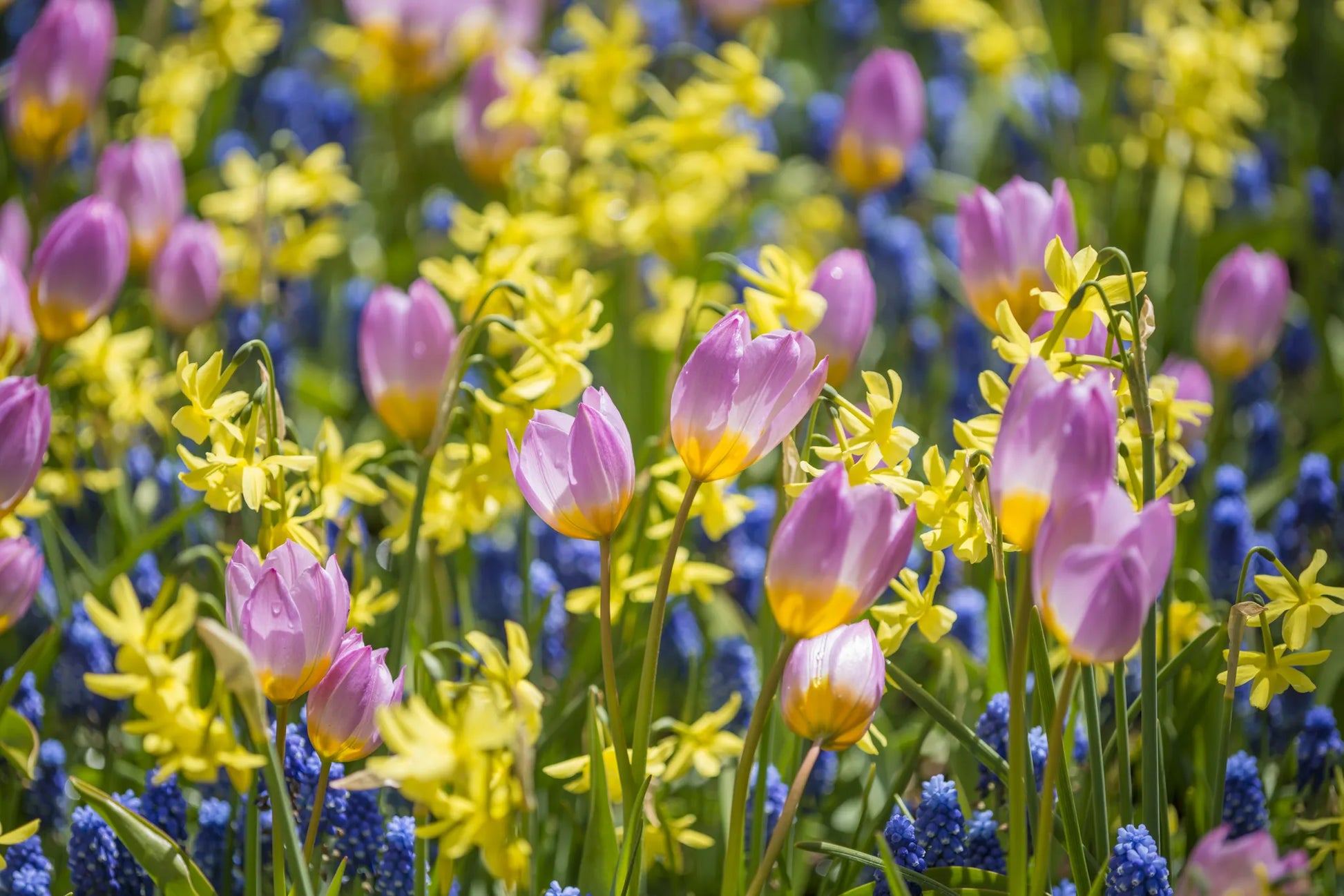The color palette of bulbs is extremely rich. We find bright yellows (Winter Aconite, Sternbergia, Narcissus), pure whites (Erythronium, Galanthus, Leucojum, Lilium candidum, Ornithogalum, Anemones), a wide range of blues and purples (Allium, Camassia, Chionodoxa, Hyacinthus, Iris, Muscari, Puschkinia, Scilla), pinks and purples (Allium, Anemones, Convallaria (rarely), Hyacinthus, Lilium, Muscari, Tulips). Tulips offer the greatest variety of colors and patterns.